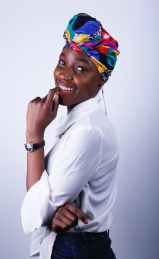 side view photo of smiling woman in white dress shirt black jeans and multicolored headscarf posing in front of white background August 5, 2020August 5, 2020