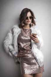 photo of woman in white fur coat shiny dress and sunglasses standing in front of gray wall while using her phone May 5, 2020May 5, 2020