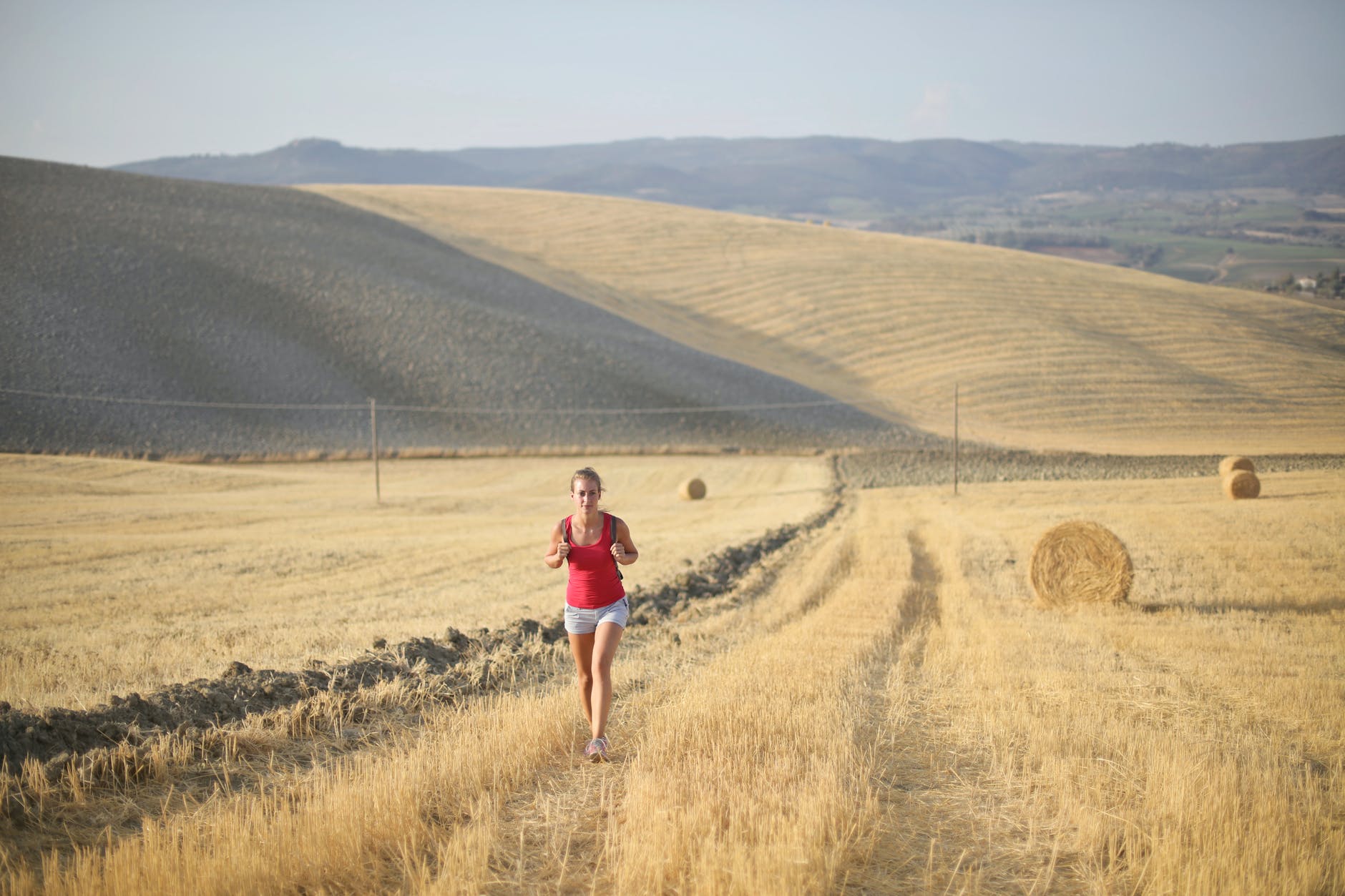 woman in red tank top walking on hay field