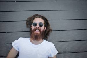 a joyous man lying on a wooden floor