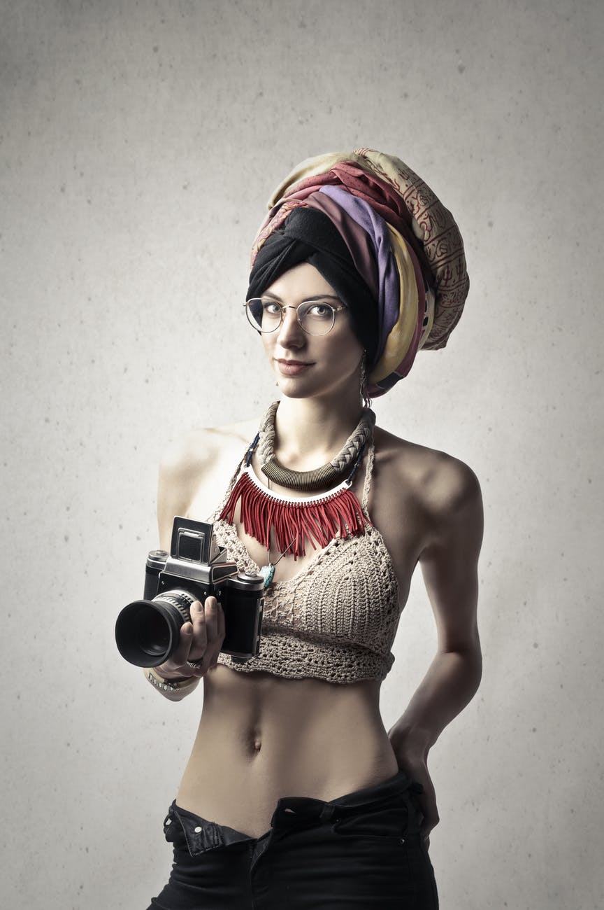 woman in knitted top holding black camera