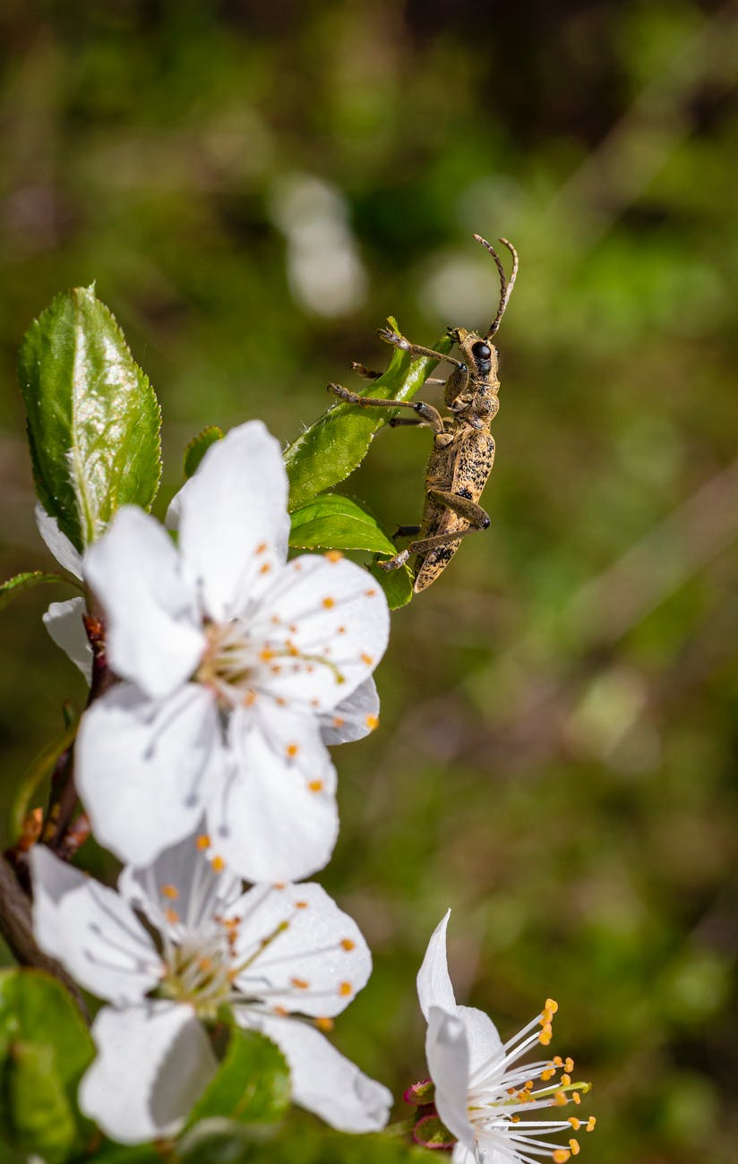 brown beetle perched on white flower