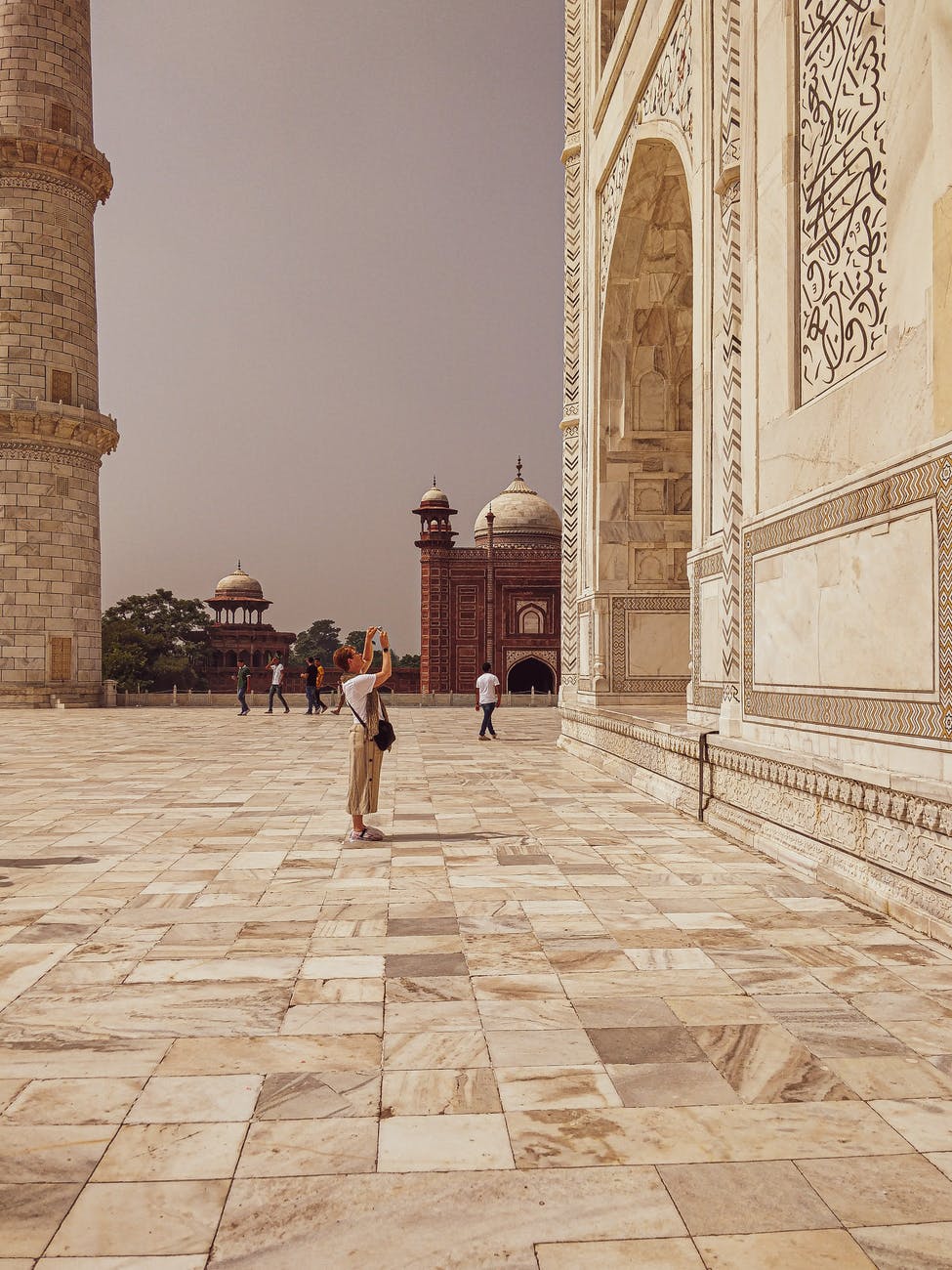 exterior of taj mahal in india with tourists walking around