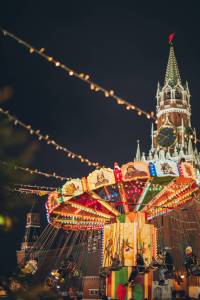 colorful luminous carousel against kremlin on red square at night
