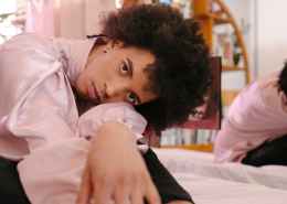 tender ethnic androgyne lying on bed looking at camera
