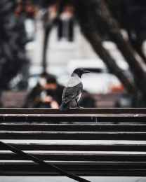 black and white bird on brown wooden fence