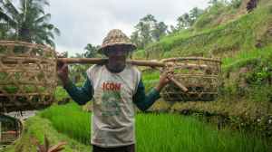 man in long sleeve shirt holding brown wooden stick with baskets
