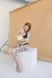 young tattooed mother in underwear embracing newborn baby in modern studio July 15, 2020July 15, 2020
