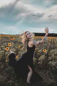 woman in black dress standing on sunflower field