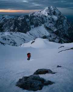 person in red jacket and black pants walking on snow covered ground