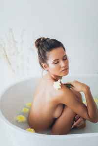 topless woman in bathtub with white flower