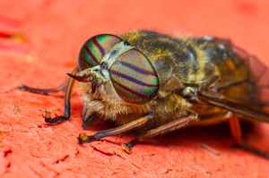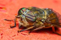 green and black fly on brown surface