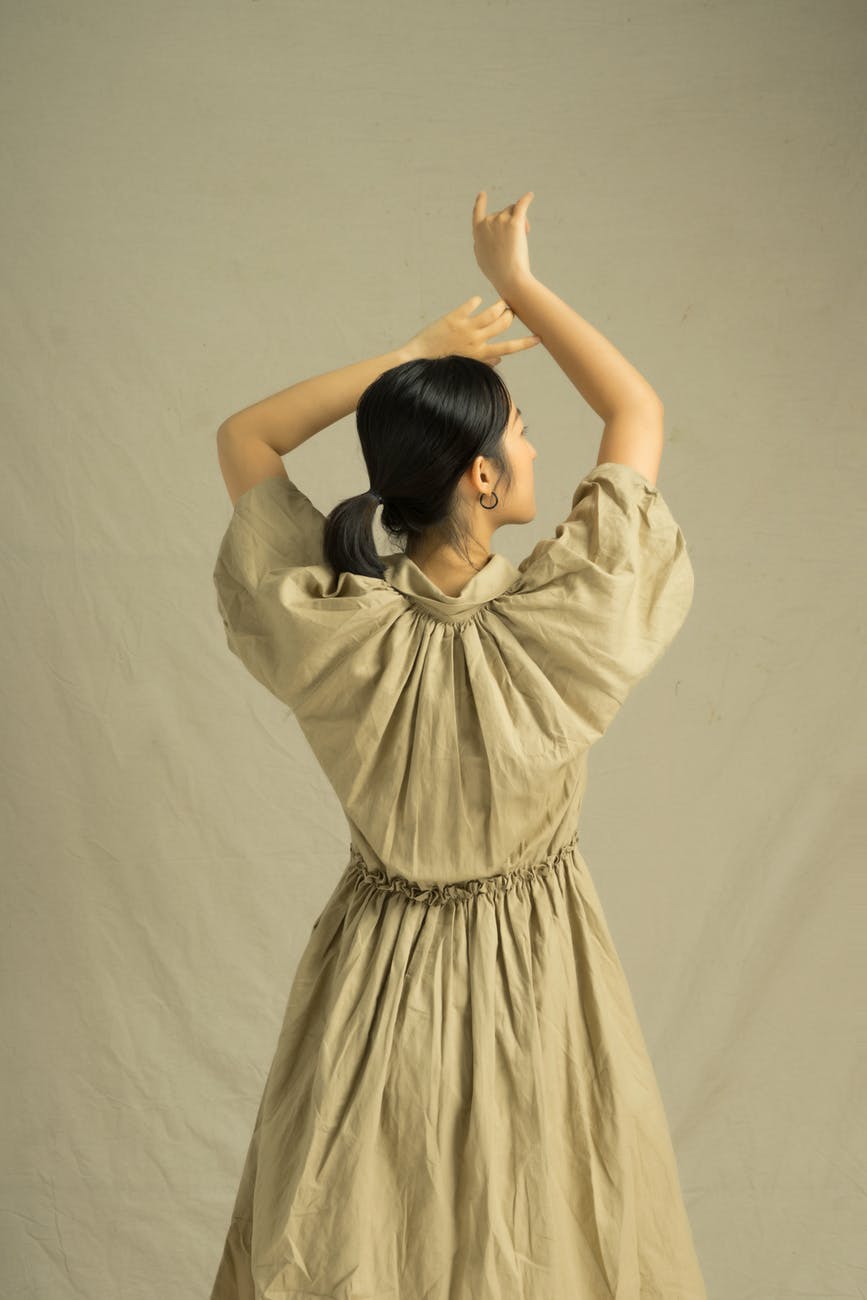 back view of a woman in brown dress