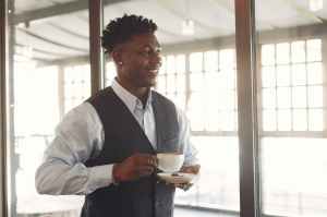 smiling young ethnic man drinking coffee in cafe near window