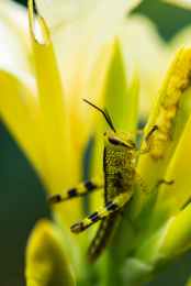 yellow and black grasshopper on yellow flower