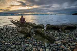 man sitting on a big rock