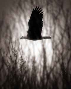 black and white eagle flying