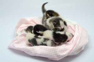 white and black kittens lying on pink and white textile