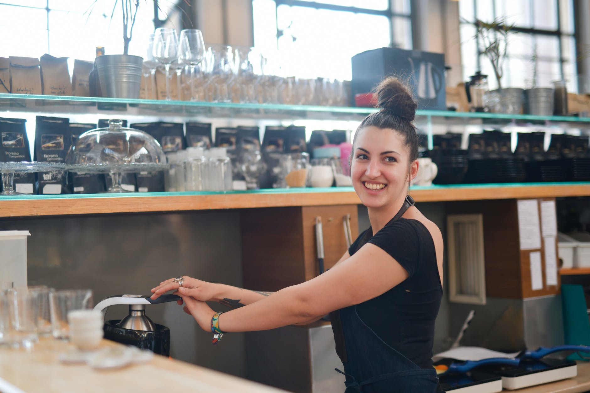 cheerful female bartender preparing fresh drink in juicer in modern cafe