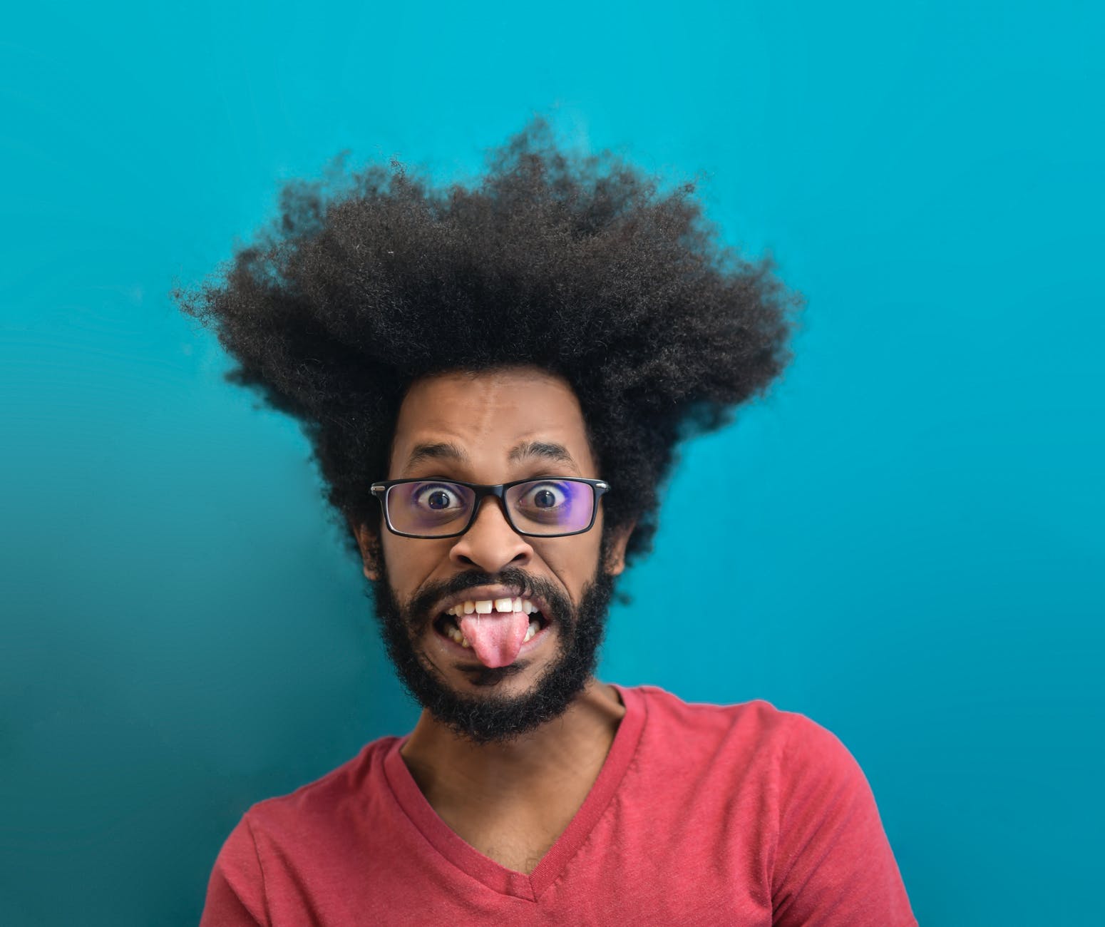 man in red crew neck shirt wearing black framed eyeglasses