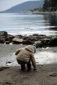 little kid playing with toy on wet shore in overcast day during weekend
