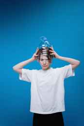 woman wearing plastic bottle on head