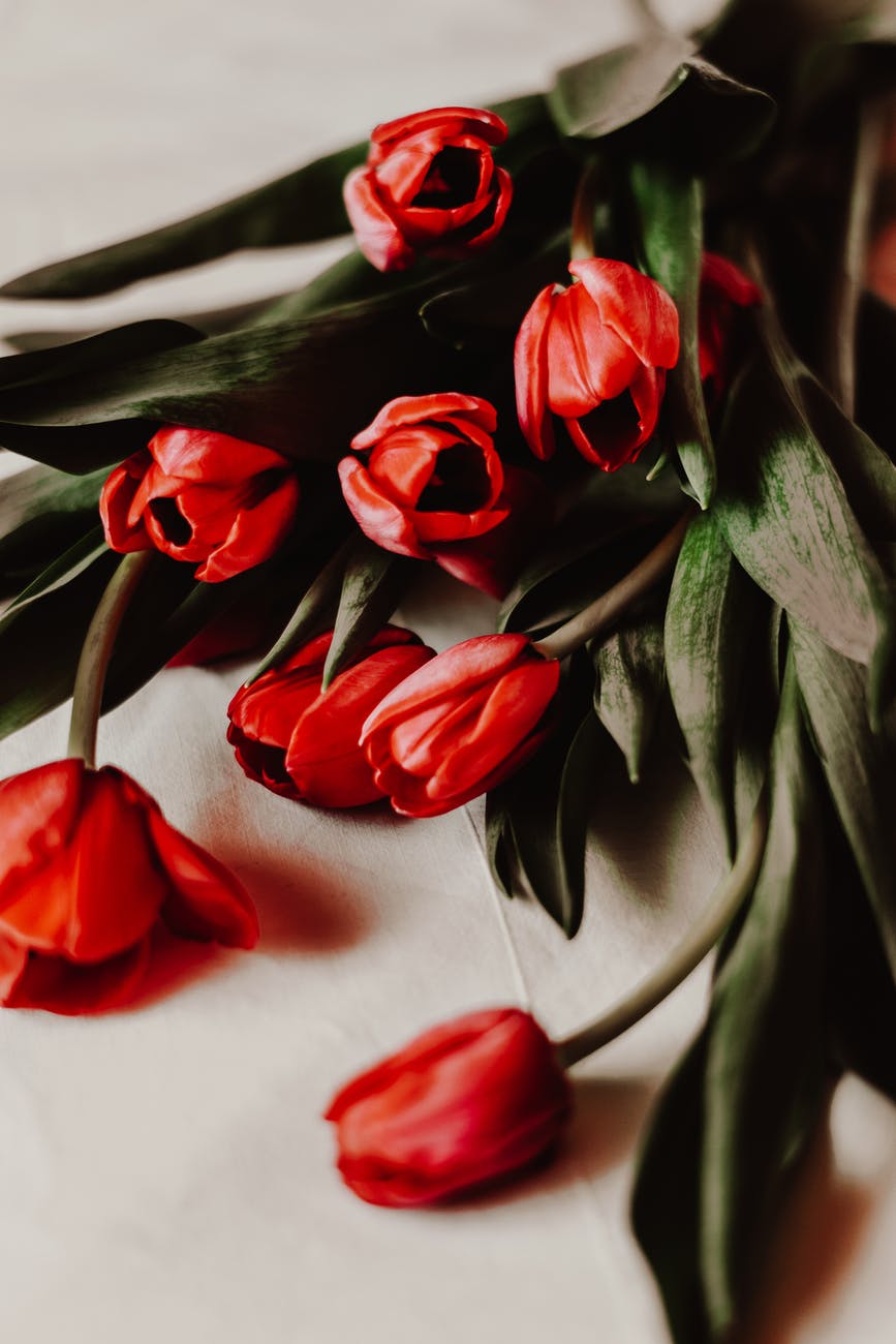 red tulips on white textile
