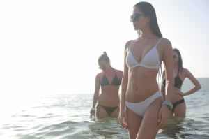 woman in white bikini standing on water