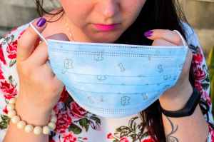 woman holding white and blue mask