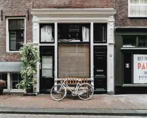 brown bicycle parked beside black and white concrete building