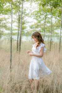 woman in white dress standing on brown grass field
