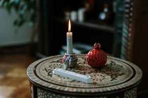 table with a candle and a ceramic pomegranate