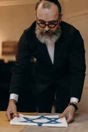 bearded man folding the flag of israel