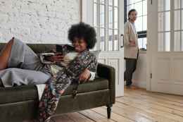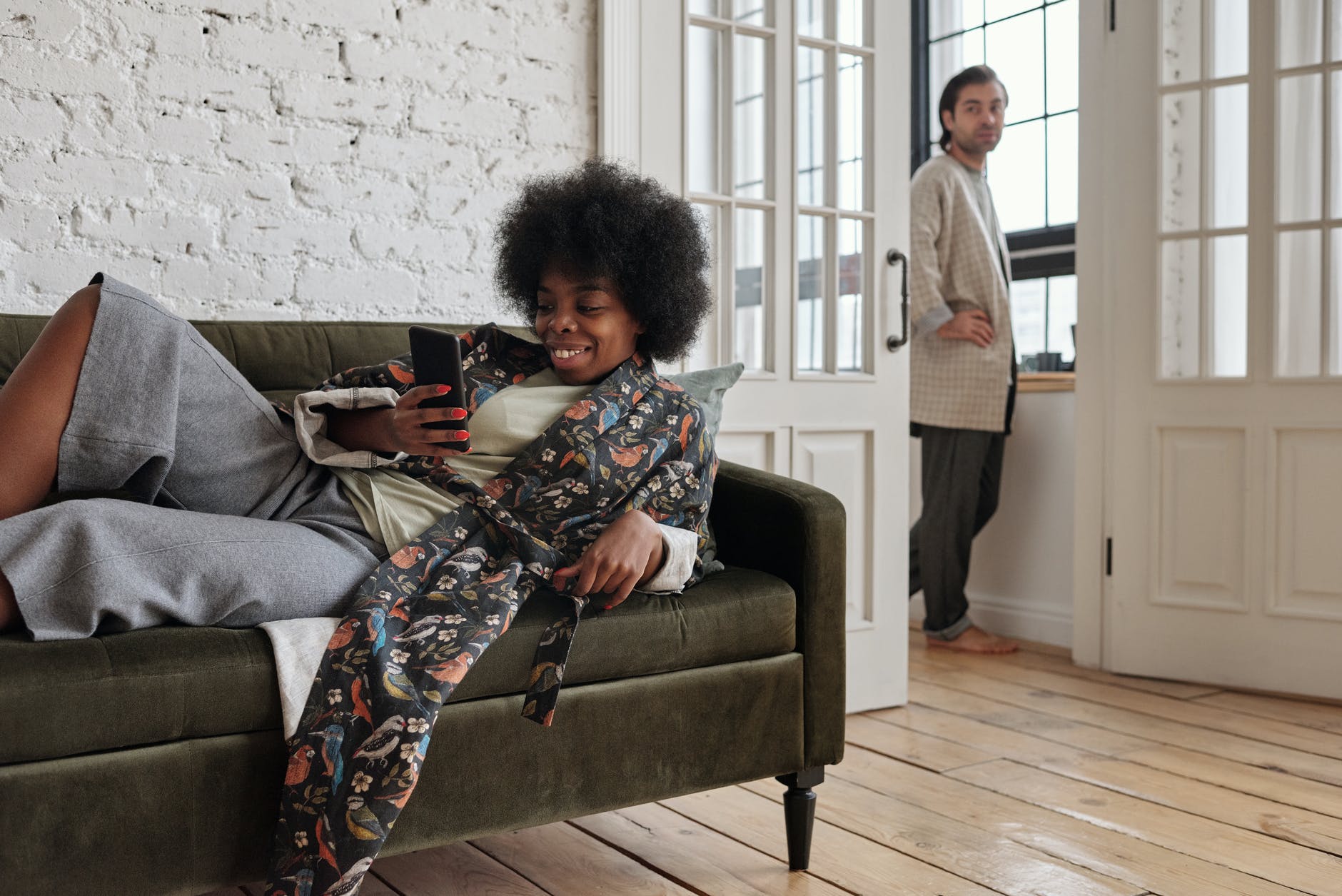 woman lying on a sofa with her smartphone
