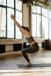 woman in a knee bending position with arms raised
