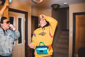 man in yellow hoodie drinking with friends