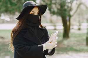 stylish woman in white latex gloves