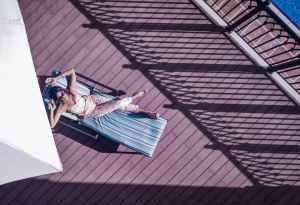 unrecognizable tourist resting on lounger on hotel terrace during vacation