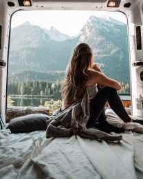 woman in the back of a van looking at mountains