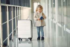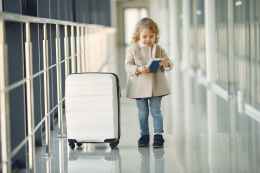 happy little girl with suitcase and passport in airport corridor