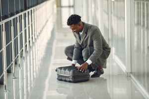 elegant businessman with suitcase standing in airport hallway