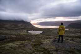 unrecognizable tourist exploring mountains and lake under overcast sky