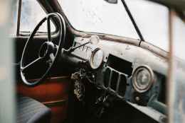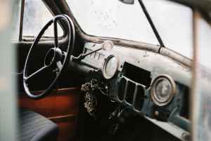 interior of retro car with speedometer and steering wheel