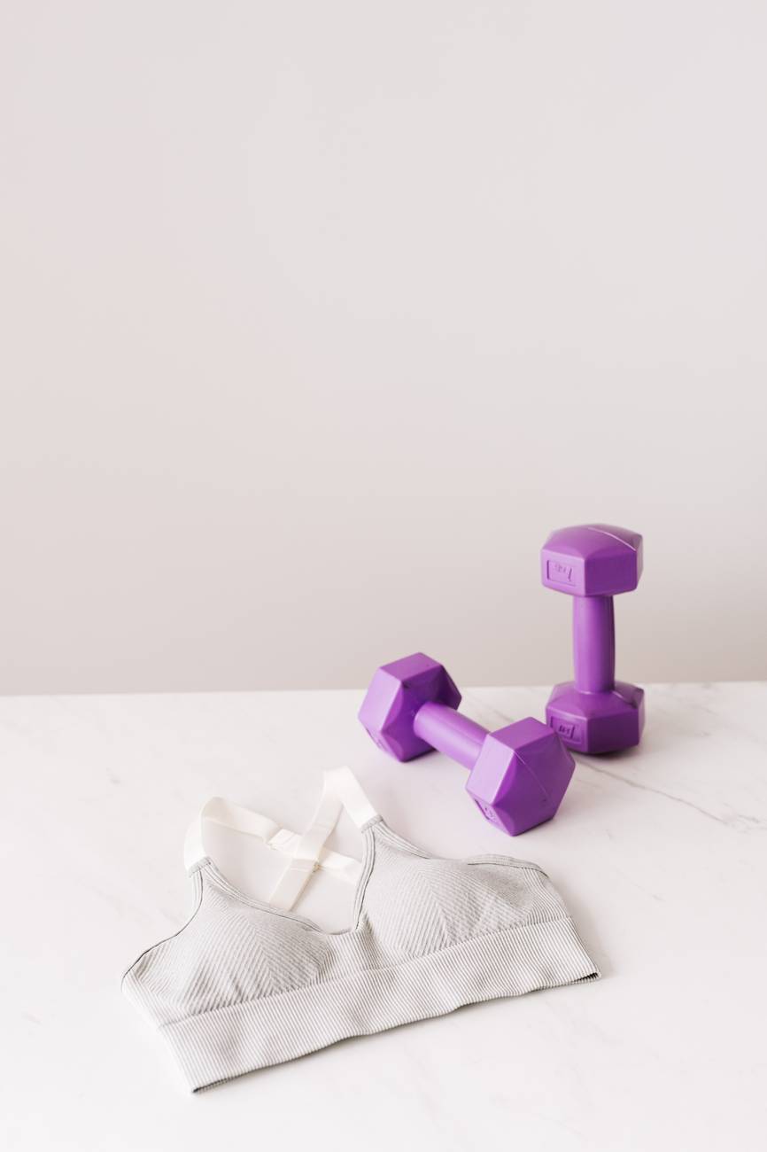 purple dumbbells and white sport bra on table