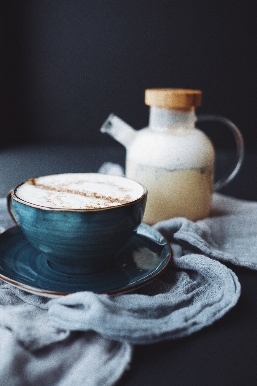 beautiful cup of coffee drink and glass kettle placed on black table