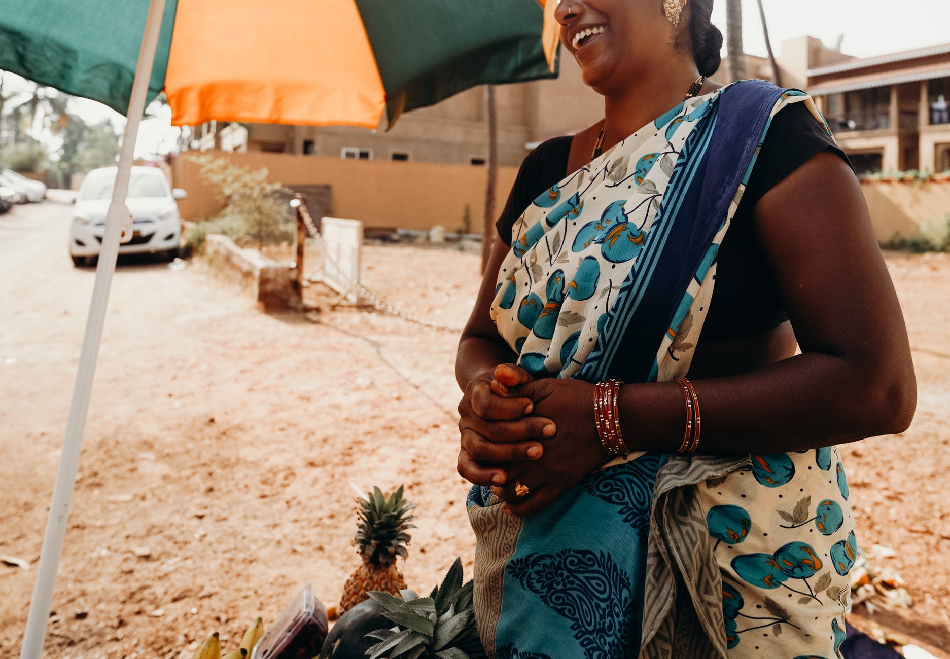 woman in blue and white floral sleeveless dress holding pineapple fruit