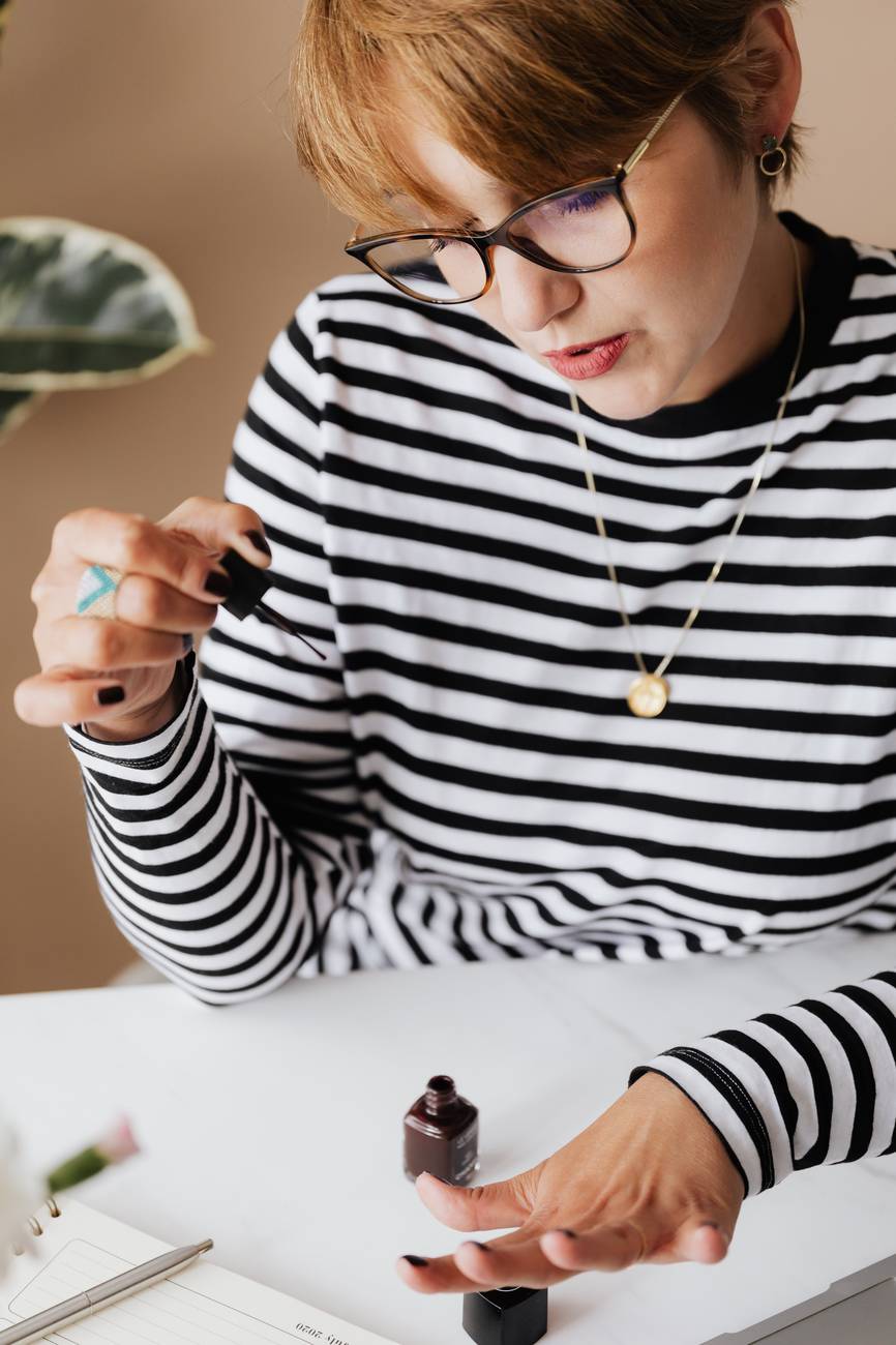 young woman in glasses polishing nails at home