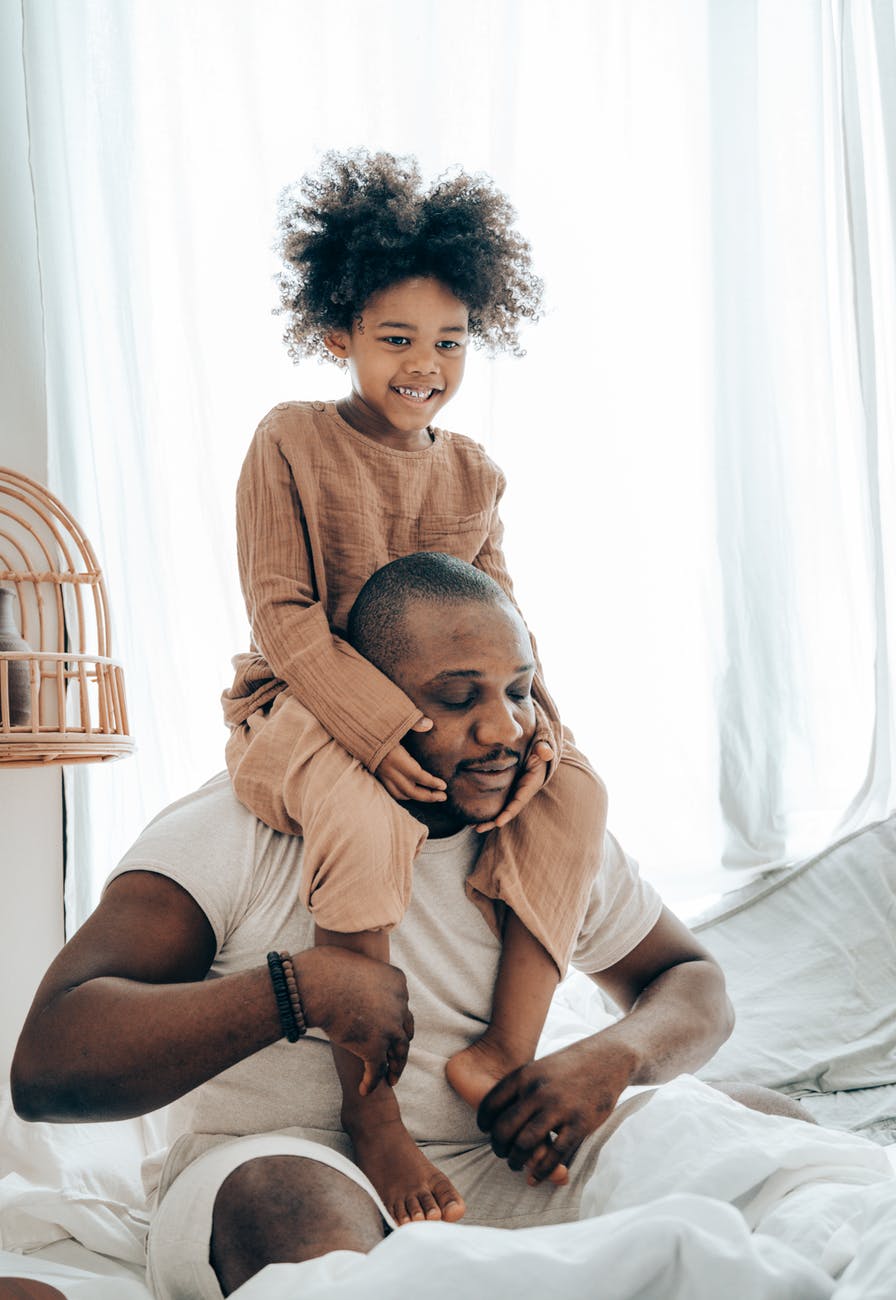 happy little black kid sitting on shoulders of dad