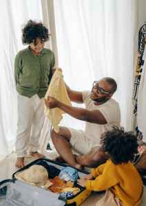 content black father with kids packing suitcase