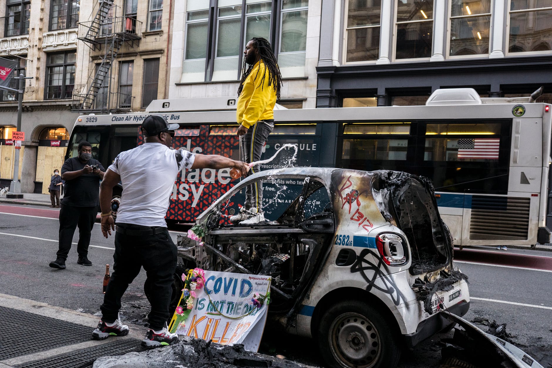 man posing on top of a burned police car